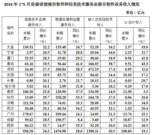2014年1—5月,我国软件和信息技术服务业实现软件业务收入13254亿元,同比增长20.9%,比去年同期回落3.3个百分点。其中,软件产品完成收入4141亿元,信息系统集成服务完成收入2649.3亿元,信息技术咨询服务完成收入1399.2亿元,数据处理和运营服务完成收入2429.5亿元,嵌入式系统软件完成收入2230.3亿元,IC设计完成收入405.1亿元。