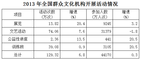 2013年末全国共有群众文化机构44260个。比上年末增加384个,其中乡镇文化站34343个,增加242个。年末群众文化机构从业人员164355人,比上年末增加8127人,群众文化机构实际使用房屋建筑面积3389.4万平方米。比上年末增长6.9%,年末群众文化机构共有馆办文艺团体6022个,演出15.13万场,观众6569万人次