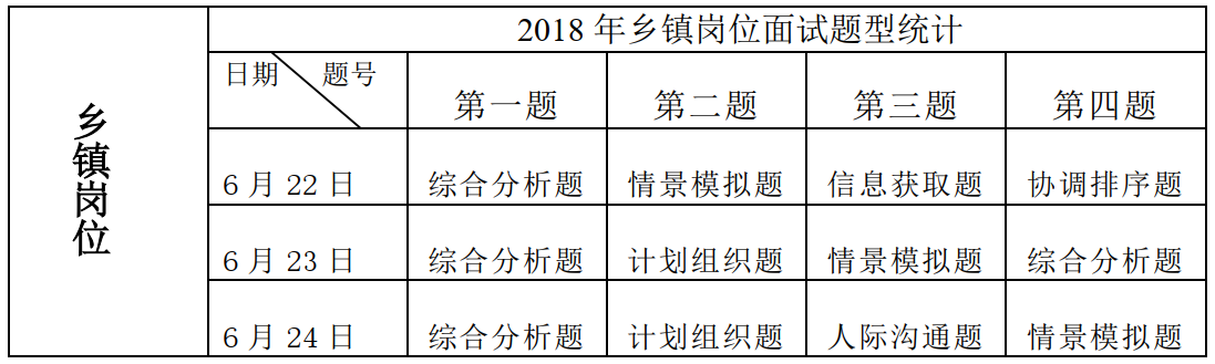 从2018年乡镇岗位面试考题统计中可以发现,乡镇岗位三套题目中,第一题均是分析评价题,分析对象主要是积极正面类是社会现象为主。在此基础上,乡镇岗位侧重考察实际处理问题的能力,从考题分布上看,主要侧重计划组织能力和沟通表达能力的考察,其中计划组织能力主要考察以调研为主的信息获取能力和宣传推广能力。沟通表达能力主要以情景模拟和演说的方式进行。在2021年乡镇岗位的面试中,重点抓住这几类题型,提高针对性。